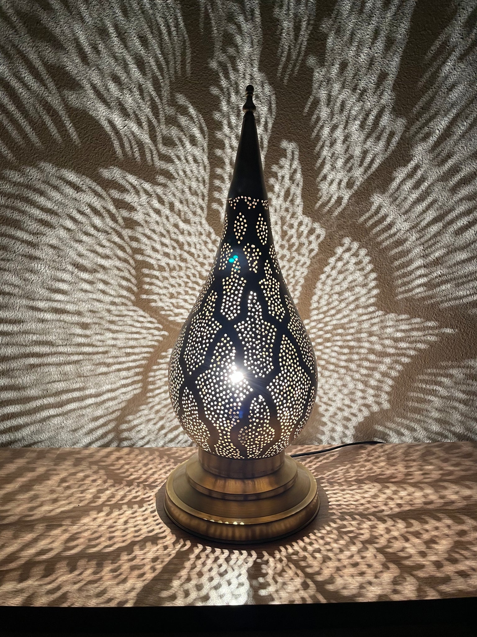 Unsere marokkanische Tischlampe „Essaouira“ ist ein handgefertigtes Einzelstück aus echt vergoldetem Messing. Mit ihrer eleganten, spitzen Form und den fein von Hand eingestanzten Mustern wird sie zum besonderen Blickfang in jedem Raum.