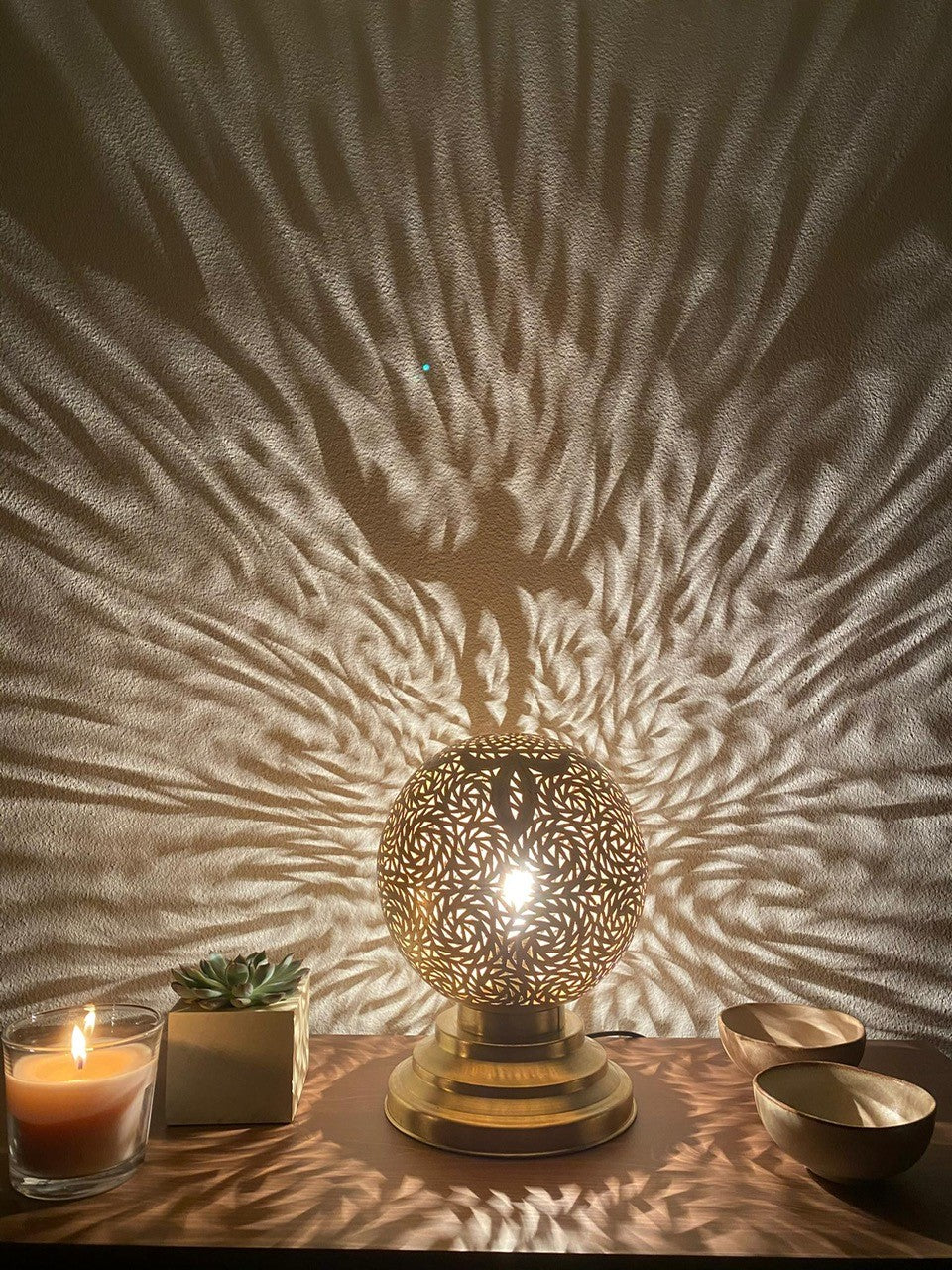 Durch die vielen von Hand eingestanzten Öffnungen entstehen feine Licht- und Schattenspiele, die deine Wände sanft erhellen und an die Magie aus 1001 Nacht erinnern. Ob in orientalisch eingerichteten Räumen oder als stilvoller Akzent in modernen und mediterranen Wohnkonzepten – diese Lampe ist ein echter Blickfang.